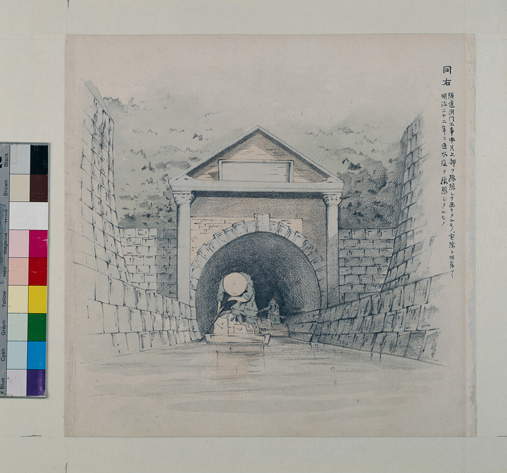 同右〔長等山隧道西口〕 隧道導門工事中其上部ヲ豫想シテ画キタルモノ、実際ト相違アリ/明治二十二年ニ通水後ヲ豫想シタルモノ
