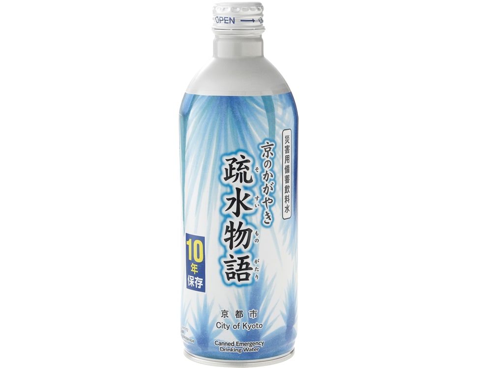京都市の水道水を、災害用備飲料水として製造しました。製造後、常温未開封で10年間保存が可能です。