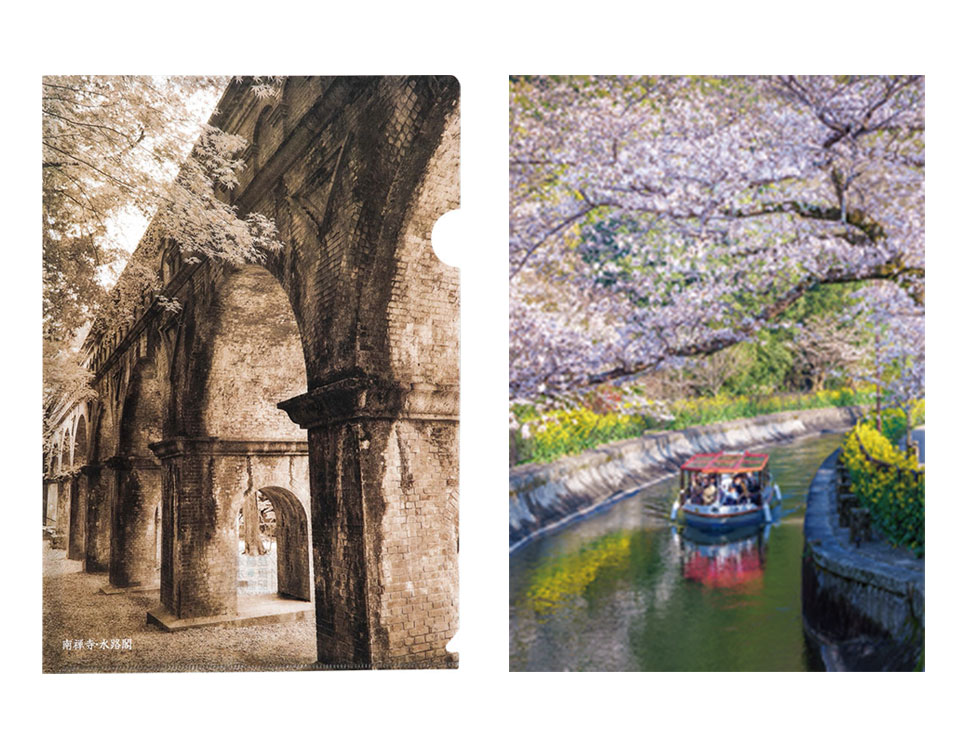 水路閣とびわ湖疏水船の写真のクリアファイルです。水路閣は、田邉朔郎が南禅寺境内の景観に配慮し、設計・デザインを行いました。びわ湖疏水船は春と秋に運航し、春は桜や菜の花、秋は紅葉をお楽しみいただけます。