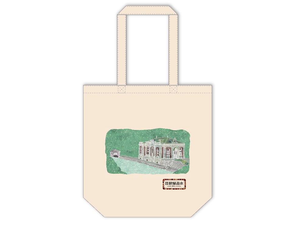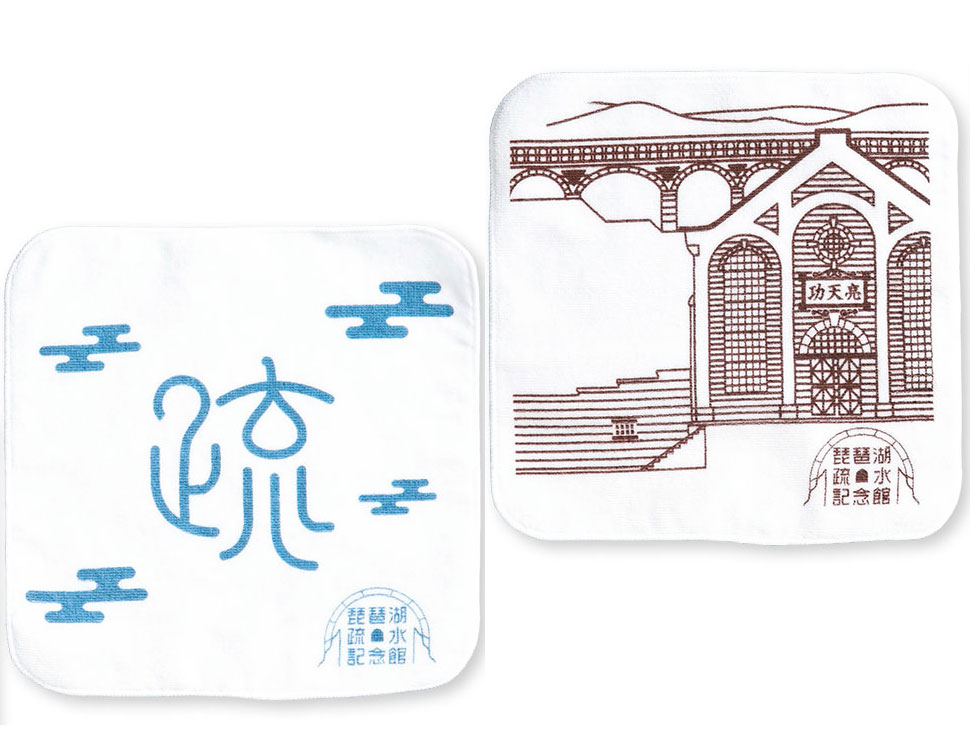 左は、疏水工事で使用した煉瓦の表面に刻まれた「疏」の文字を、右は、琵琶湖疏水にまつわる施設である水路閣と蹴上発電所をデザインしました。上質な肌触りの生地を使用しています。