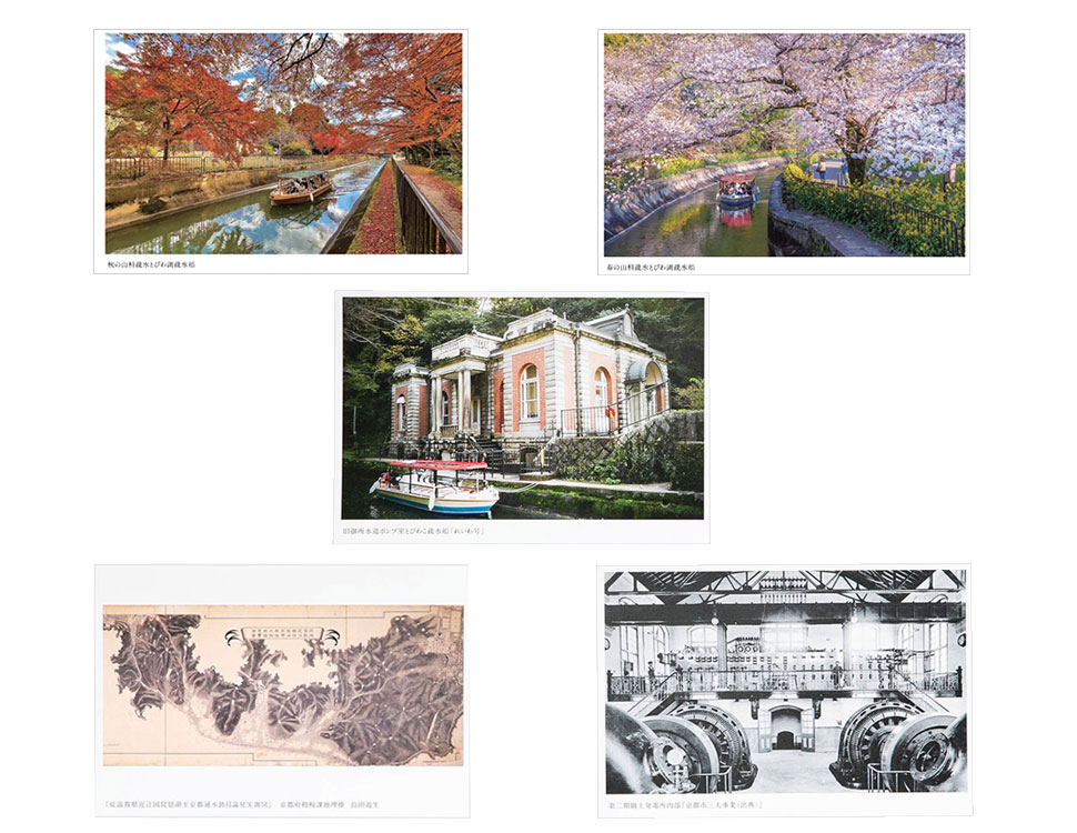 「びわこ疏水船(3種類)」、「従滋賀県近江国琵琶湖至京都通水路目論見実測図」、「第二蹴上発電所内部」の絵はがきです。